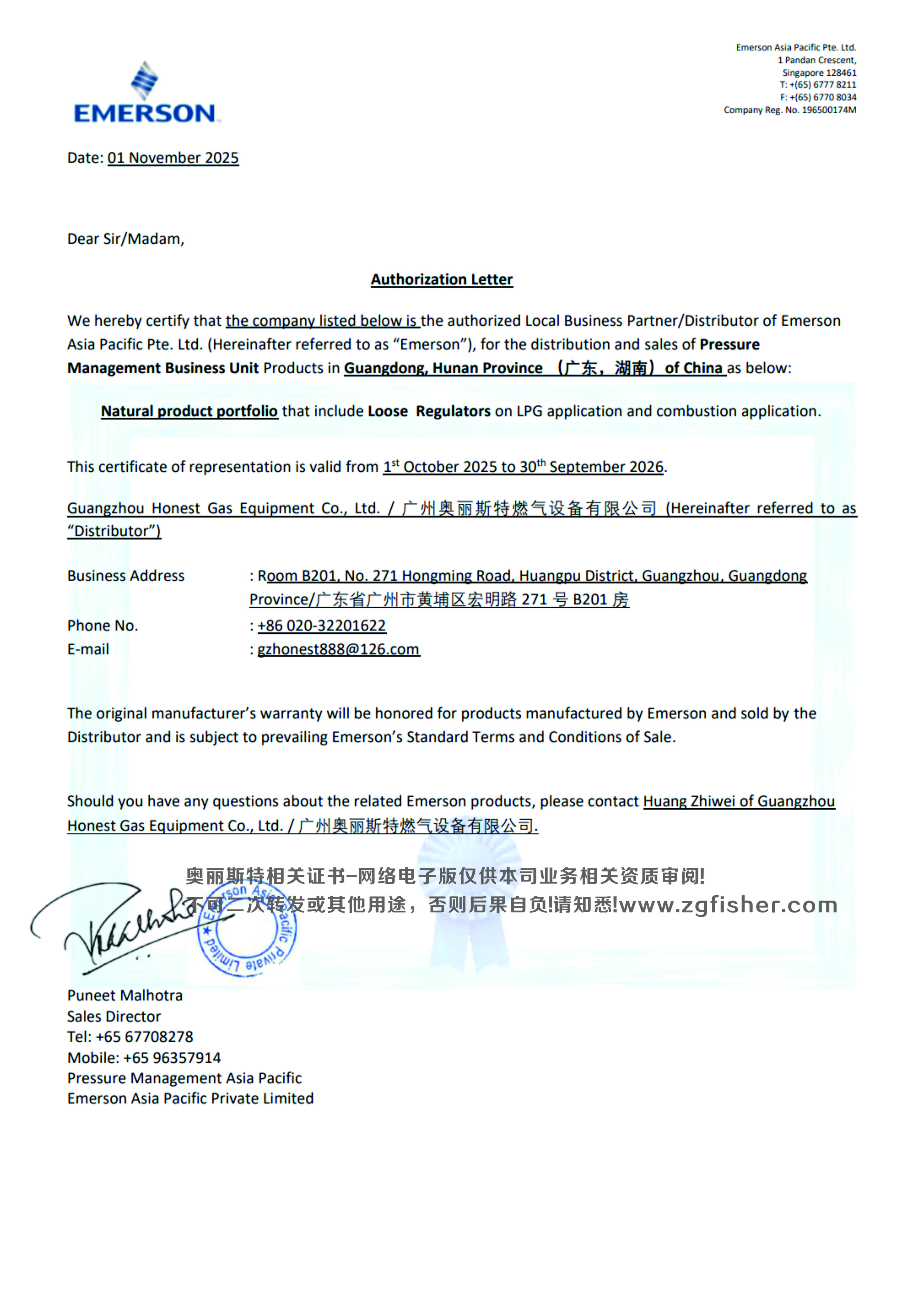 2022年度代理證書EMERSON艾默生/FISHER費(fèi)希爾